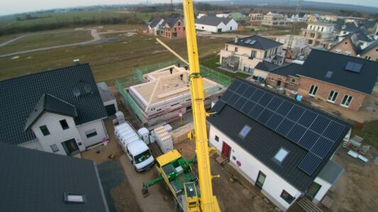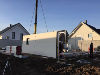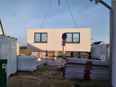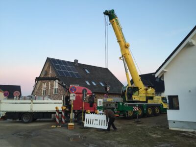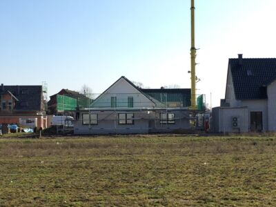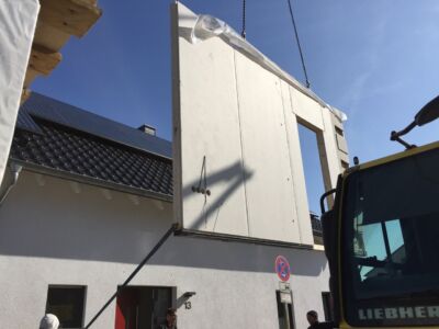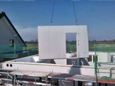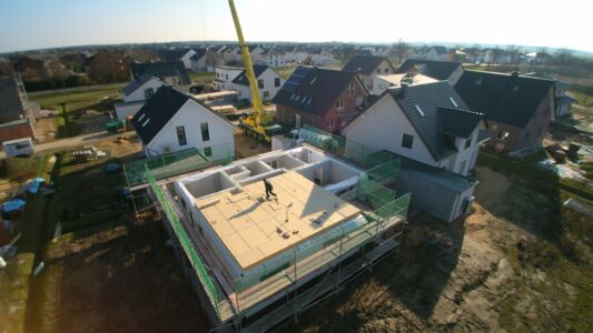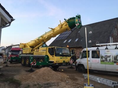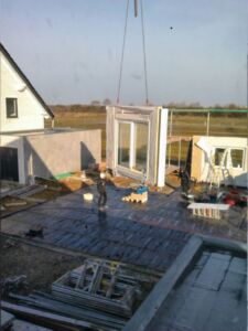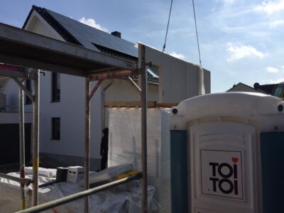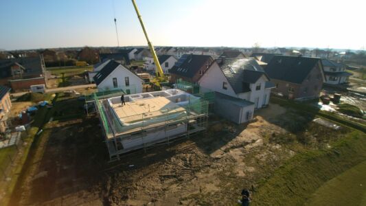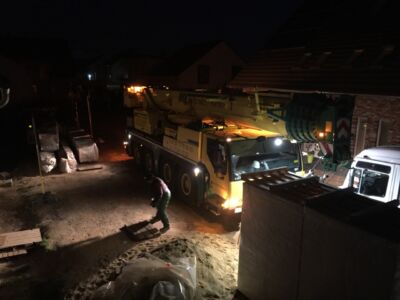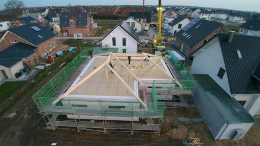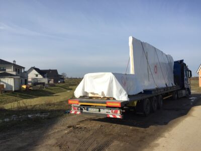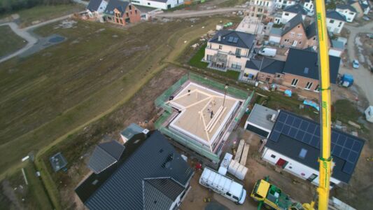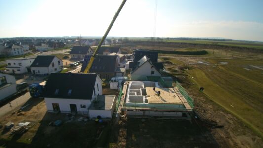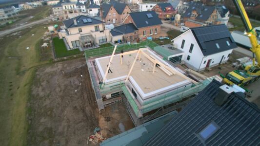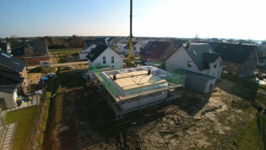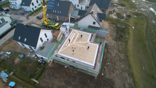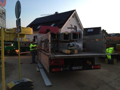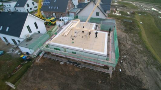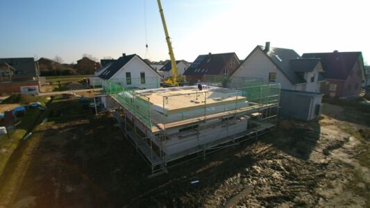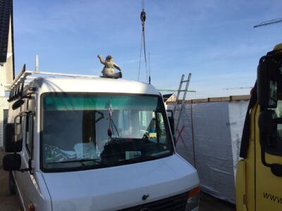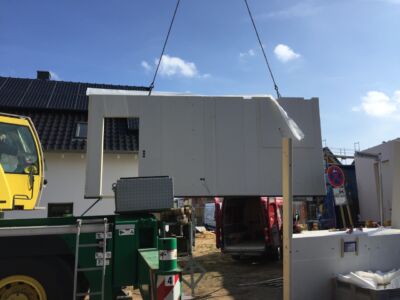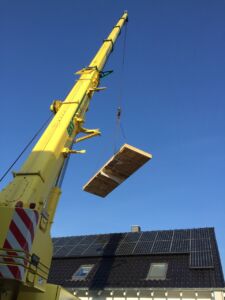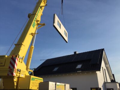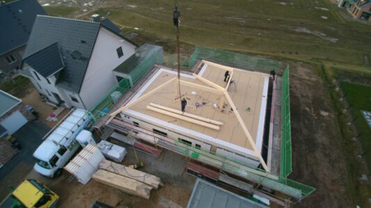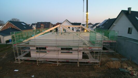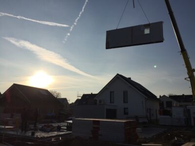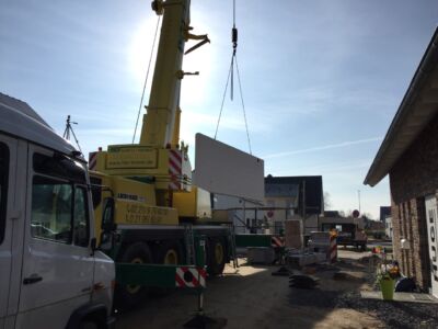 09. März 2016: Das Haus kommt. Und zwar schon früh am Morgen um 06:00 Uhr. Die LKW´s mit den Hausteilen stehen schon im Baugebiet, der Kran ist aufgebaut und die Jungs vom Montage-Trupp legen ein Tempo vor, dass einem schwindelig wird. Schnell ist die erste Wand gestellt, dann eine nach der anderen. Alles ist perfekt organisiert, jeder Handgriff sitzt. Das Wetter ist sonnig, jedoch recht windig mit Böen. Das geht eine Weile gut, aber dann bei der langen Vorderwand mit der Haustür sind die Windböen so stark, dass die Wand um Haaresbreite fast mit dem Kranausleger kollidiert wäre. Das wäre eine Katastrophe geworden. Aber das Glück war diesmal auf unserer Seite. Die Monteure von OKAL entschieden sich dann, die Wände nicht mehr über das Haus des Nachbarn zu transportieren, sondern tief und dicht zwischen Kran und Nachbarhaus hindurch zu zirkeln, um der Windlast zu entgehen. Das dauert natürlich länger und ist anstrengender. Jede Wand wird mit Gurten geführt und muss mit Muskelkraft gegen den Wind in Position gehalten werden. Aber alles verläuft glatt und reibungslos. Die Decke ist dann in Null-Komma-Nix gesetzt und spät abends, gegen 19 Uhr fangen die Jungs sogar noch an, den Dachstuhl zu richten, trotz einsetzender Dunkelheit.