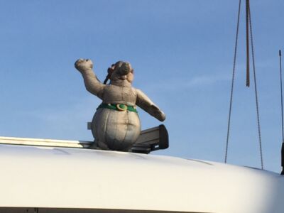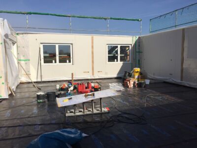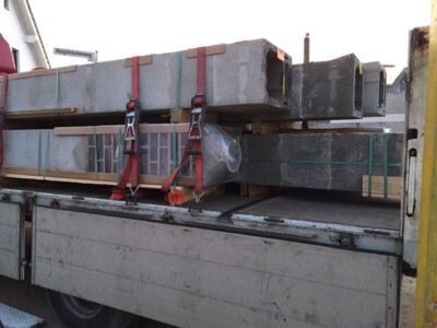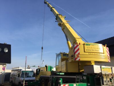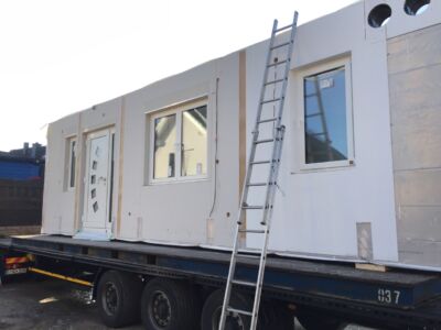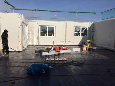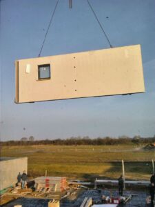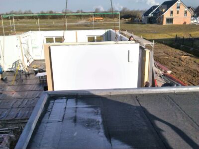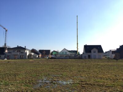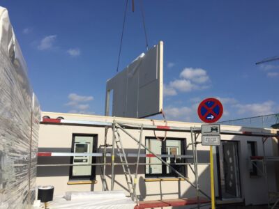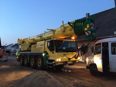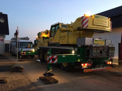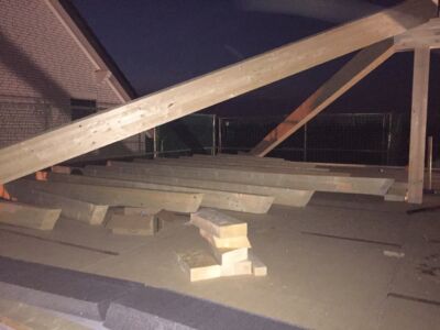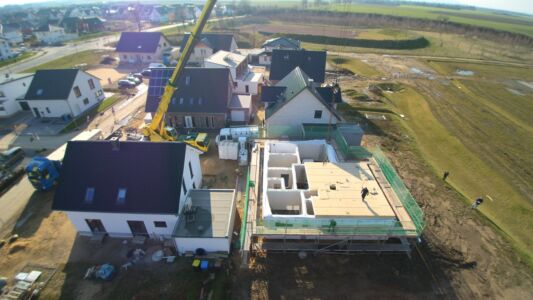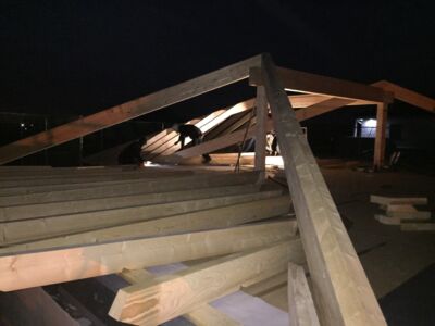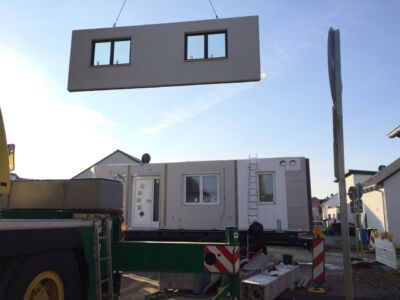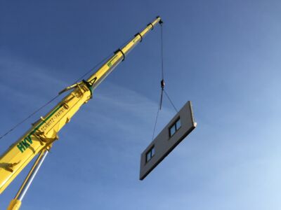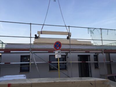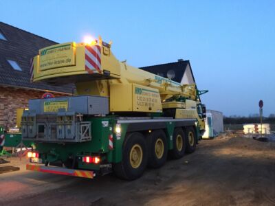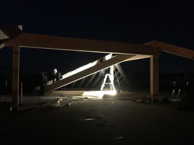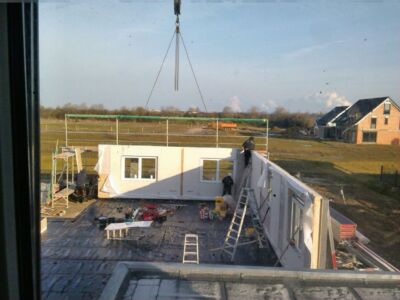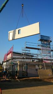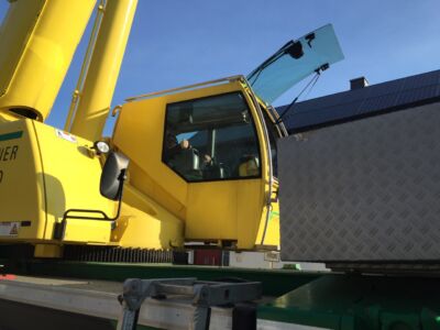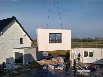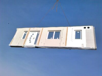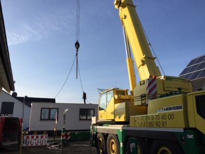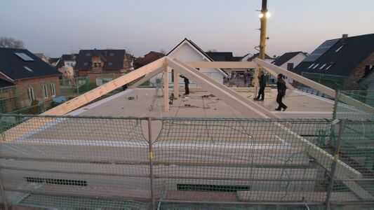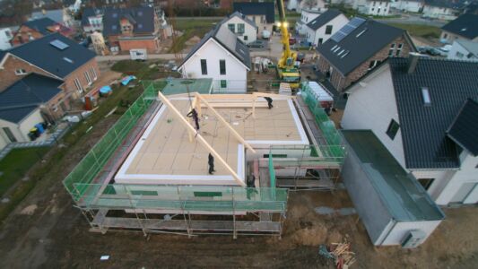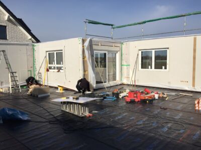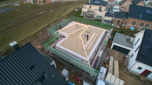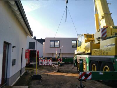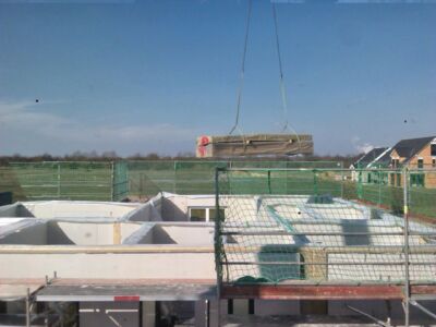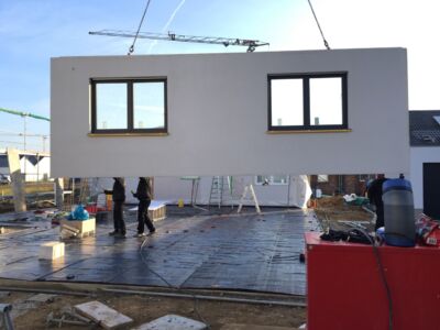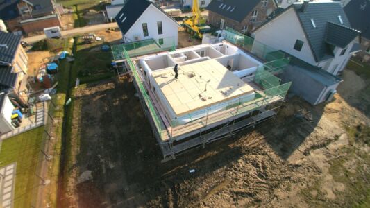 09. März 2016: Das Haus kommt. Und zwar schon früh am Morgen um 06:00 Uhr. Die LKW´s mit den Hausteilen stehen schon im Baugebiet, der Kran ist aufgebaut und die Jungs vom Montage-Trupp legen ein Tempo vor, dass einem schwindelig wird. Schnell ist die erste Wand gestellt, dann eine nach der anderen. Alles ist perfekt organisiert, jeder Handgriff sitzt. Das Wetter ist sonnig, jedoch recht windig mit Böen. Das geht eine Weile gut, aber dann bei der langen Vorderwand mit der Haustür sind die Windböen so stark, dass die Wand um Haaresbreite fast mit dem Kranausleger kollidiert wäre. Das wäre eine Katastrophe geworden. Aber das Glück war diesmal auf unserer Seite. Die Monteure von OKAL entschieden sich dann, die Wände nicht mehr über das Haus des Nachbarn zu transportieren, sondern tief und dicht zwischen Kran und Nachbarhaus hindurch zu zirkeln, um der Windlast zu entgehen. Das dauert natürlich länger und ist anstrengender. Jede Wand wird mit Gurten geführt und muss mit Muskelkraft gegen den Wind in Position gehalten werden. Aber alles verläuft glatt und reibungslos. Die Decke ist dann in Null-Komma-Nix gesetzt und spät abends, gegen 19 Uhr fangen die Jungs sogar noch an, den Dachstuhl zu richten, trotz einsetzender Dunkelheit.