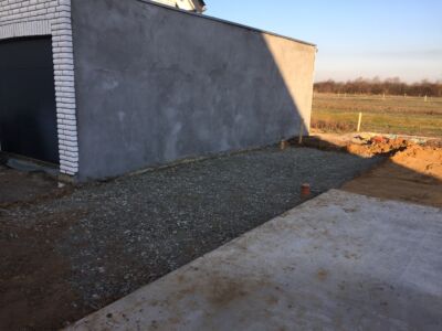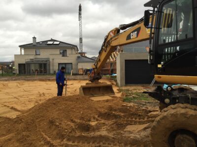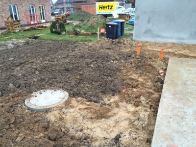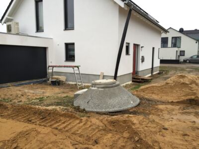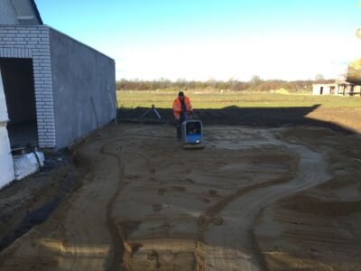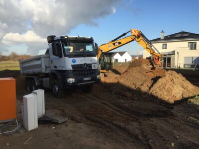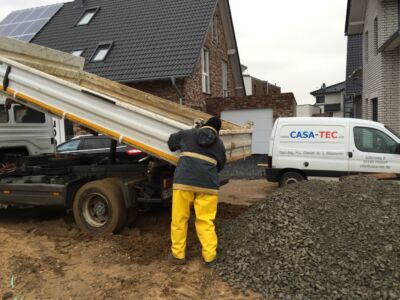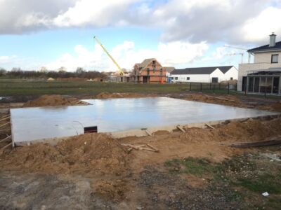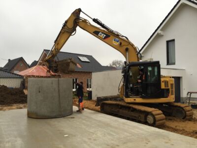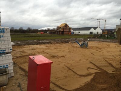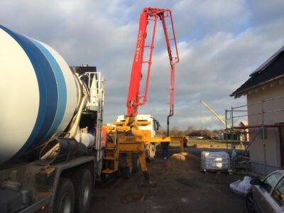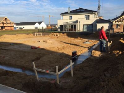 Alles ist geebnet, verdichtet und auf Niveau gebracht, die Bodenplatte kann gegossen werden. Das macht die Fa. Glatthaar-Fertigkeller für OKAL. Auch hier läuft alles reibungslos und perfekt ab. Also: Beton Marsch!