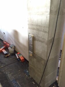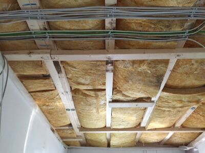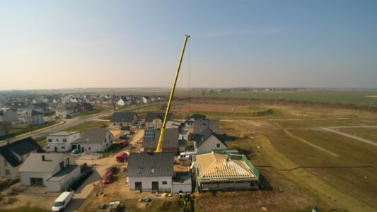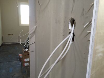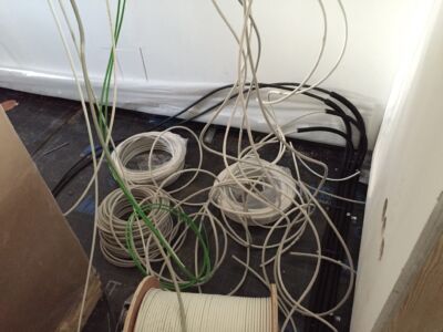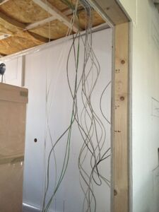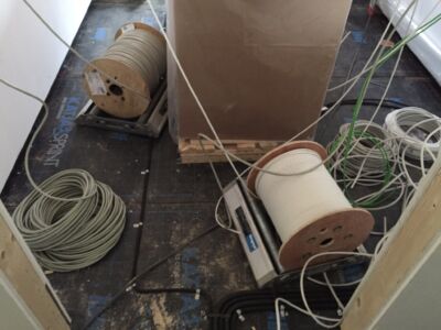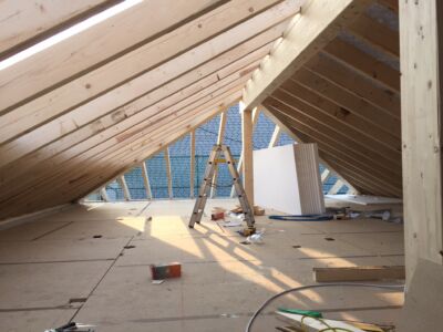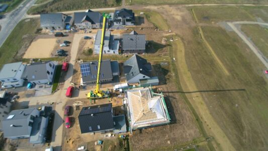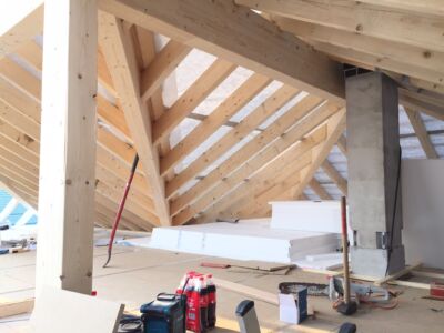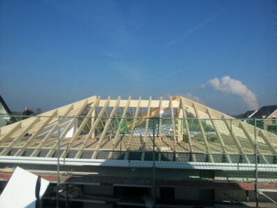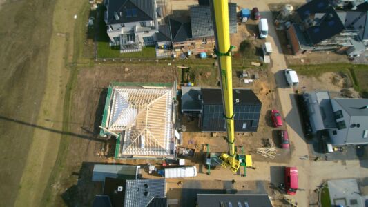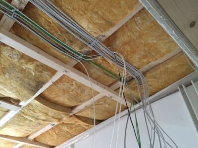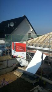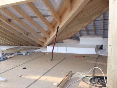 Wetter – super! Früh morgens gehts munter weiter. Heute ist der Elektronstallationsbetrieb Fa. Brune mit fünf Mann aufgeschlagen und hat begonnen, sämtliche Leitungen in das Haus zu ziehen. Ein Wahnsinn, was da alles an Kupfer zusammen kommt. Der Montagetrupp von OKAL baut heute den Dachstuhl. Auch dieser Arbeitstag hat mindestens 14 Stunden. Dafür ist abends das Dach dicht, fast die komplette Kabelage drin und die Innenräume sind mit Folien abgedichtet.
